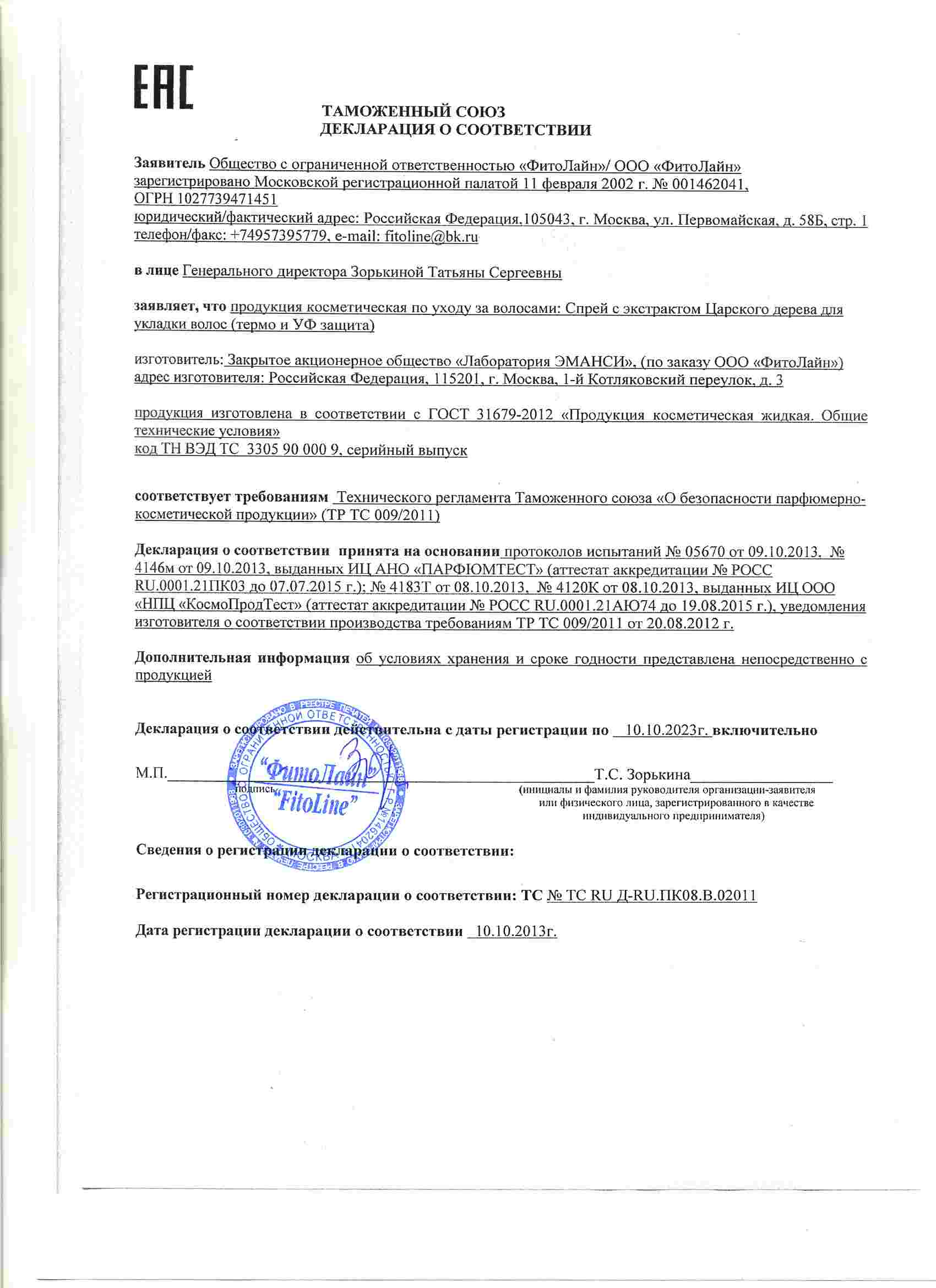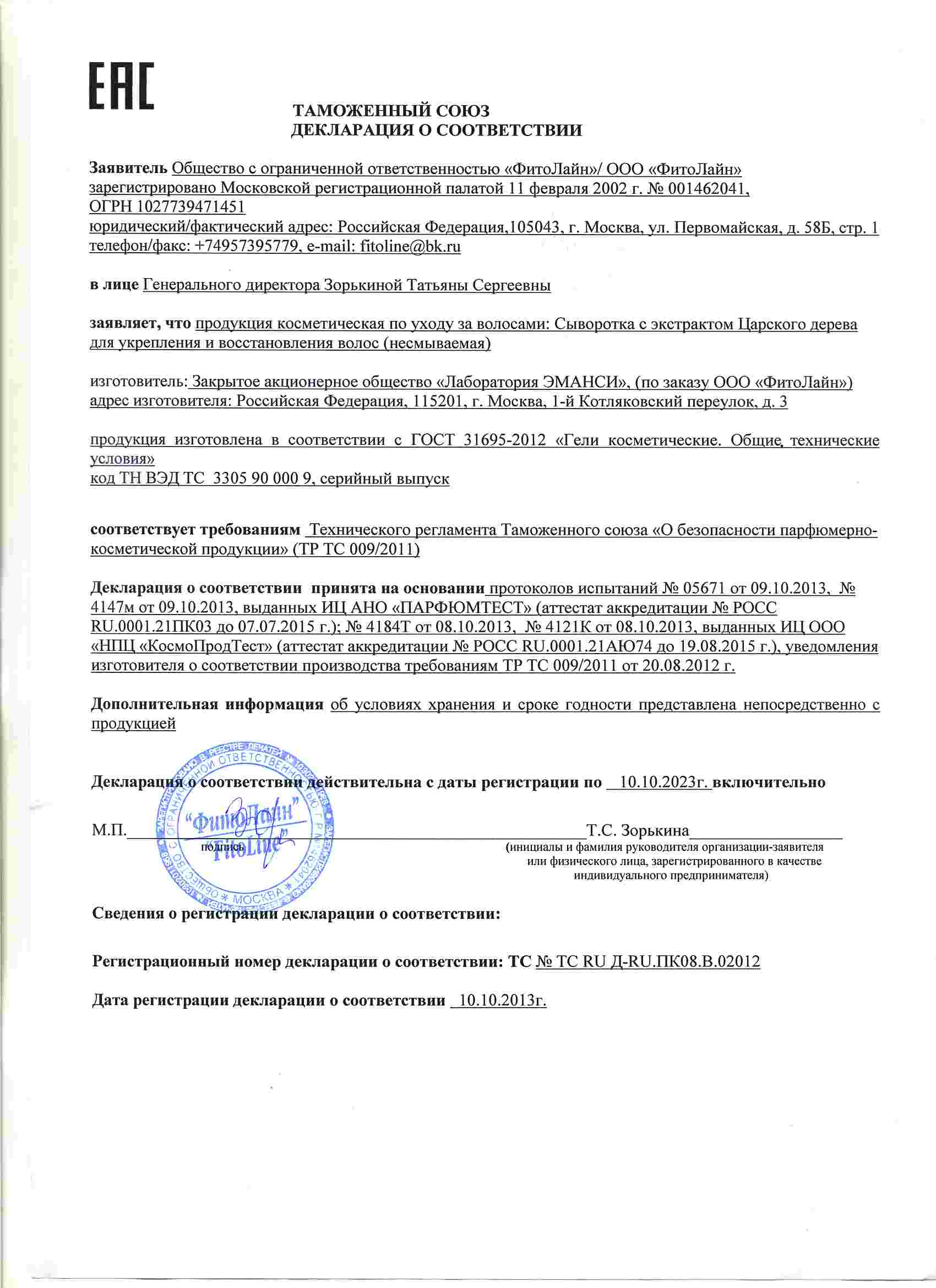 Декларация — «Сыворотка для укрепления и восстановления волос с экстрактом Царского дерева» (несмываемая)