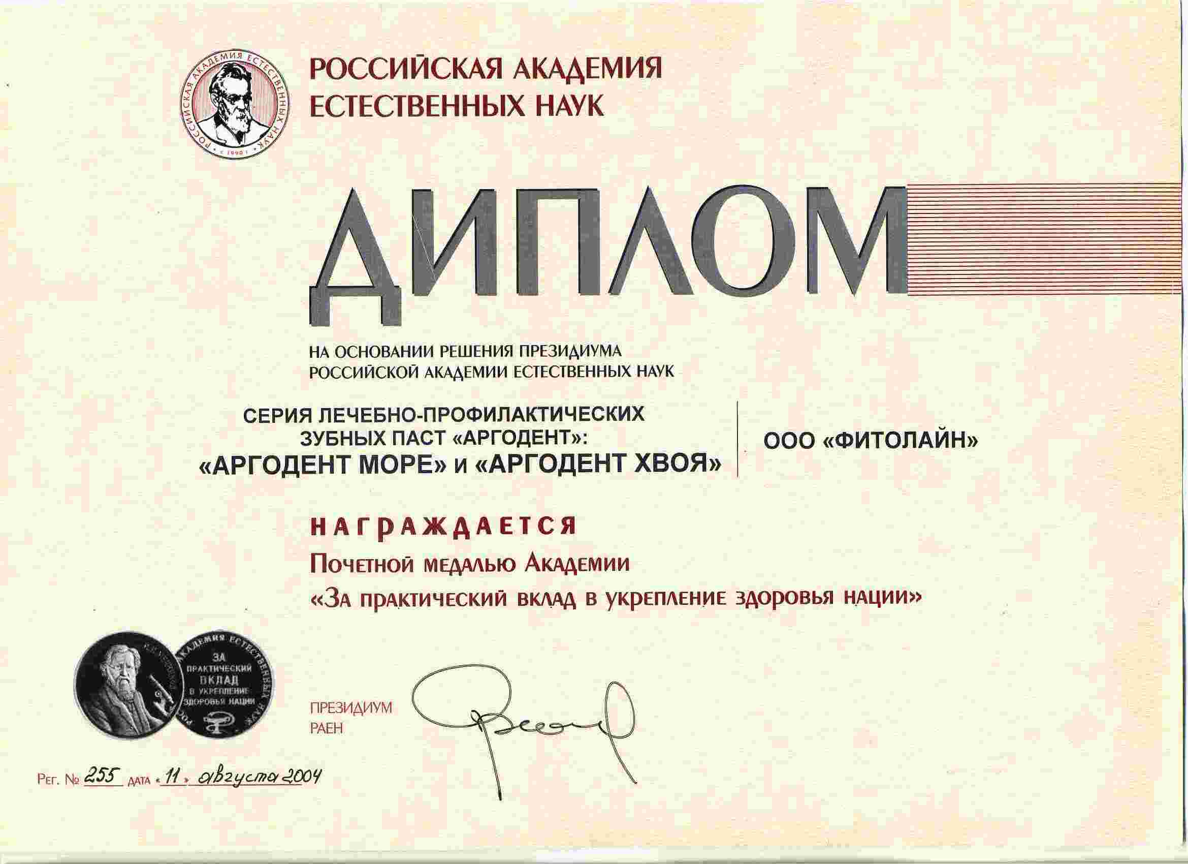 Диплом — Серия лечебно-профилактических зубных паст «АРГОДЕНТ»