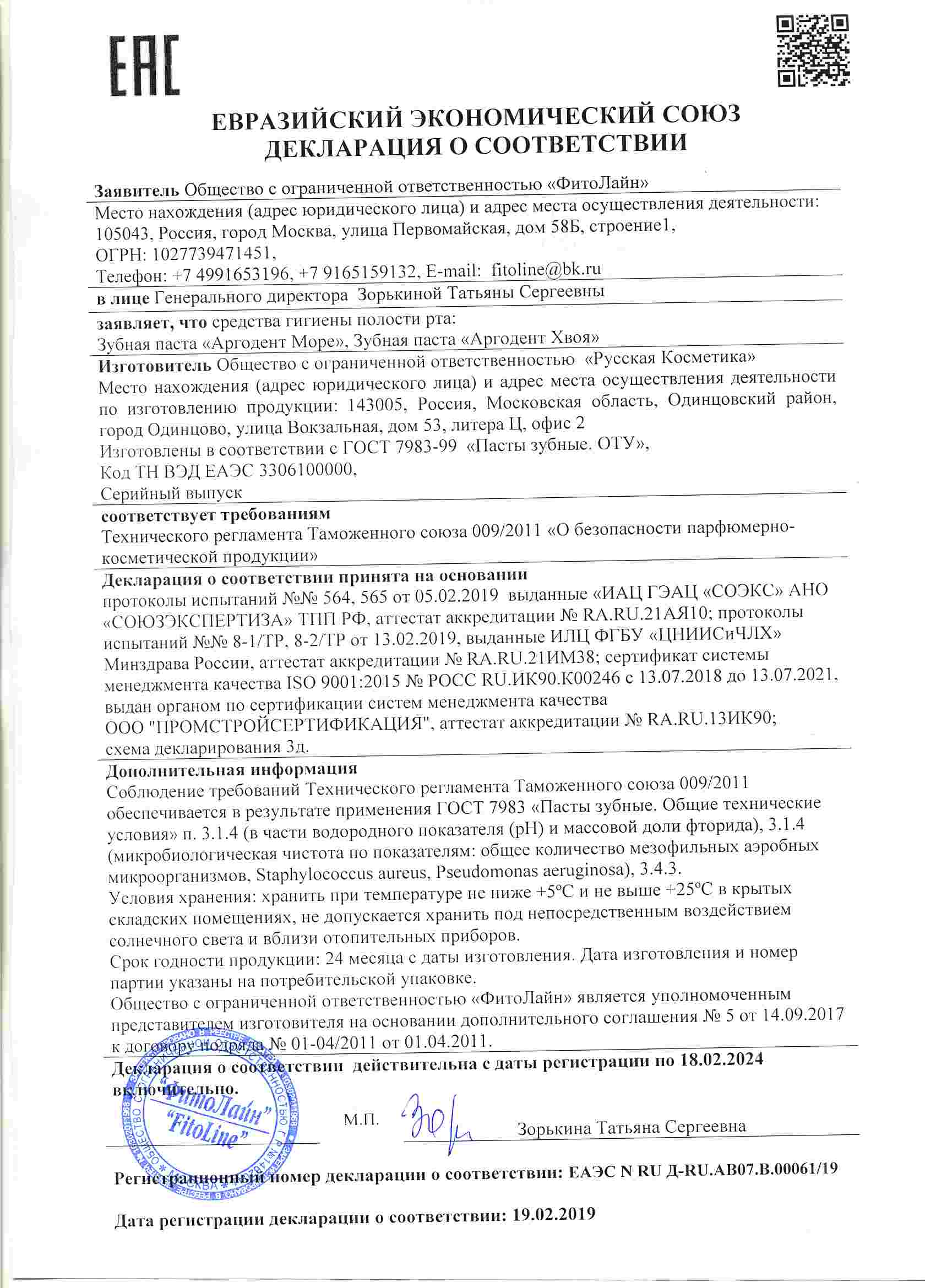 Декларация — Зубные пасты «Аргодент-Хвоя», «Аргодент-Море»