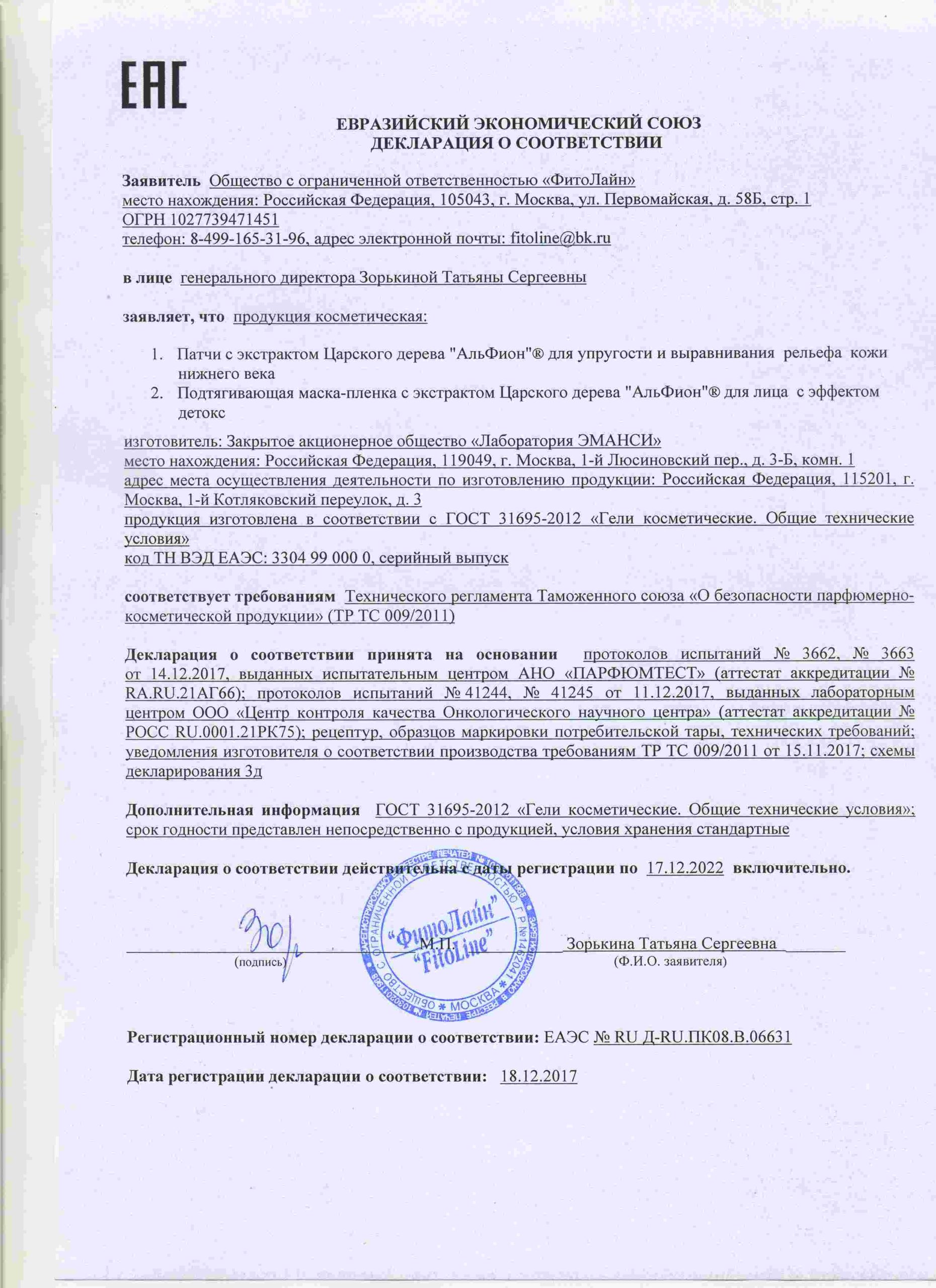 Патчи с экстрактом Царского дерева «АльФион»®. Подтягивающая маска-пленка с экстрактом Царского дерева «АльФион»® для лица.